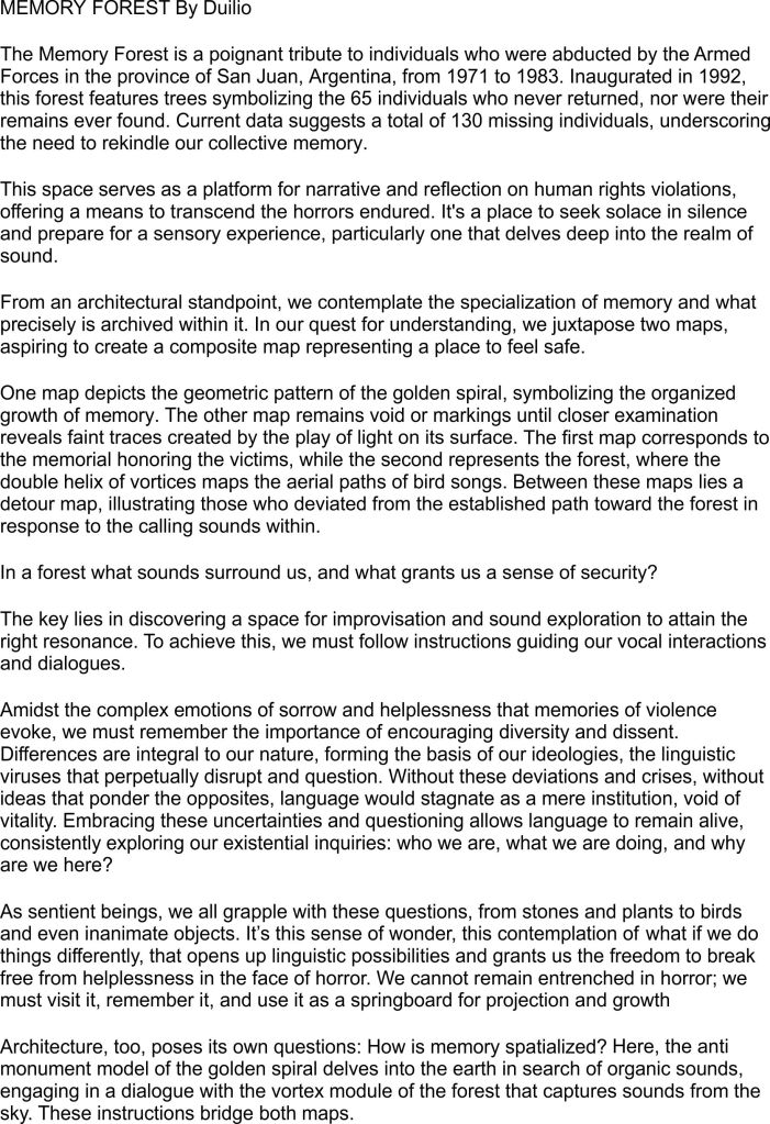 Tuvimos un embajador del proyecto Bosque Presente en la exposición TRASCENDENCE en la ciudad de Berlín, los días 12 y 13 de octubre de 2023. Duilio Tapia Morandi aplicó a la residencia FLUSSLAB para disciplinas STEAM -Science; Technology; Engineering; Arts; Math-, para desarrollar labores de investigación y producción de obra en torno a la pregunta ¿Cómo se espacializa la memoria? De esta experiencia surge Memory Forest, una instalación acusmática que interactúa con la presencia del público, sensores de proximidad activan reproductores de audio que reproducen el canto de los pájaros del Bosque de la memoria o los nombres de los desaparecidos sanjuaninos leídos al azar. La curadurìa de Memory forest estuvo a cargo de Mahzabin Haque y Carolina Boettner, Directora del programa Flusslab.